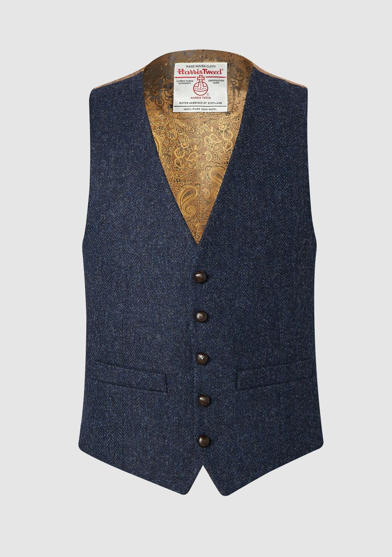 This classic 5 button Harris Tweed waistcoat by Bucktrout can be worn with or without a jacket. Although it compliments the Bucktrout Harris Tweed jacket beautifully it can also look very stylish when worn on its own. The waistcoat is finished with an attractive paisley lining to the back.