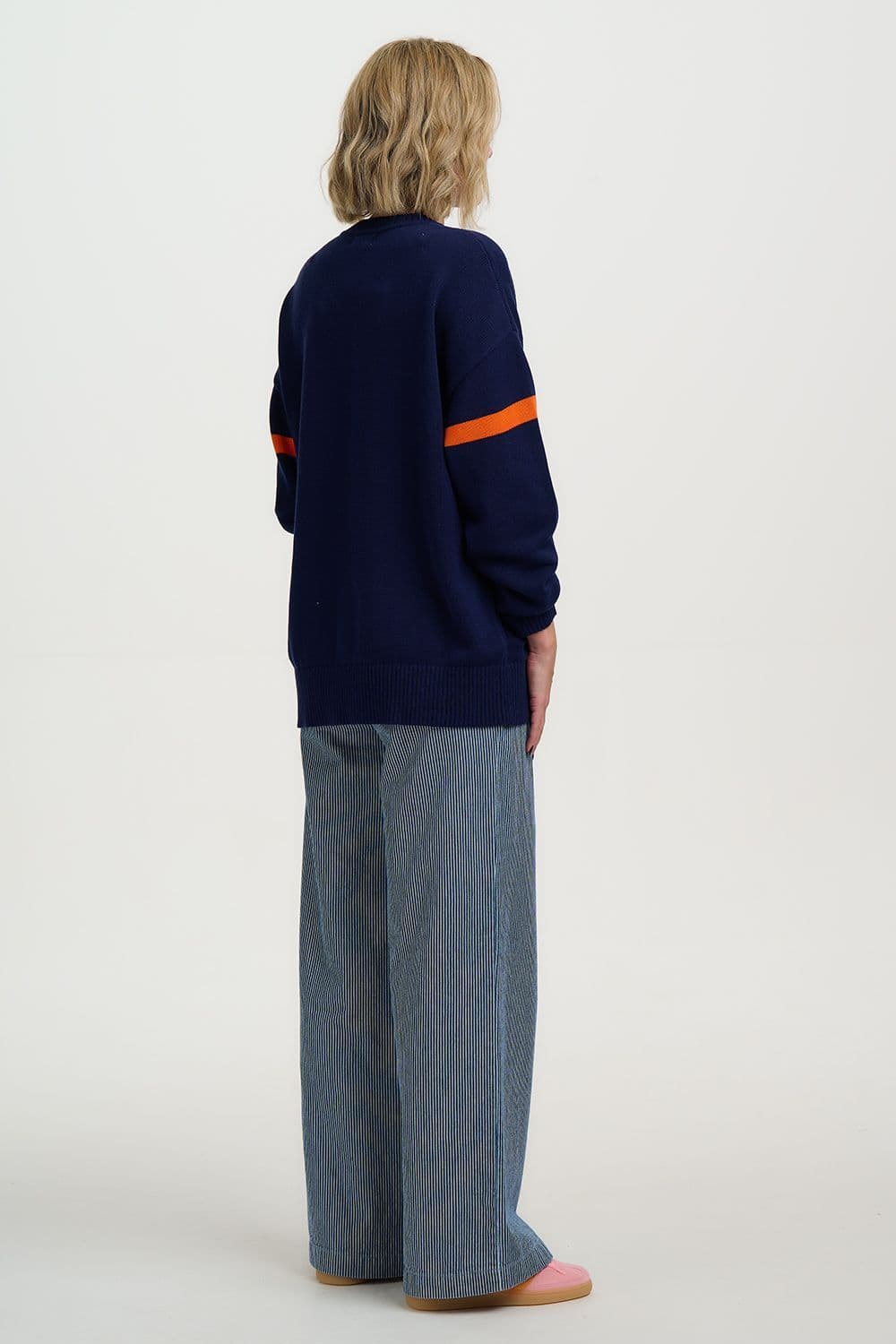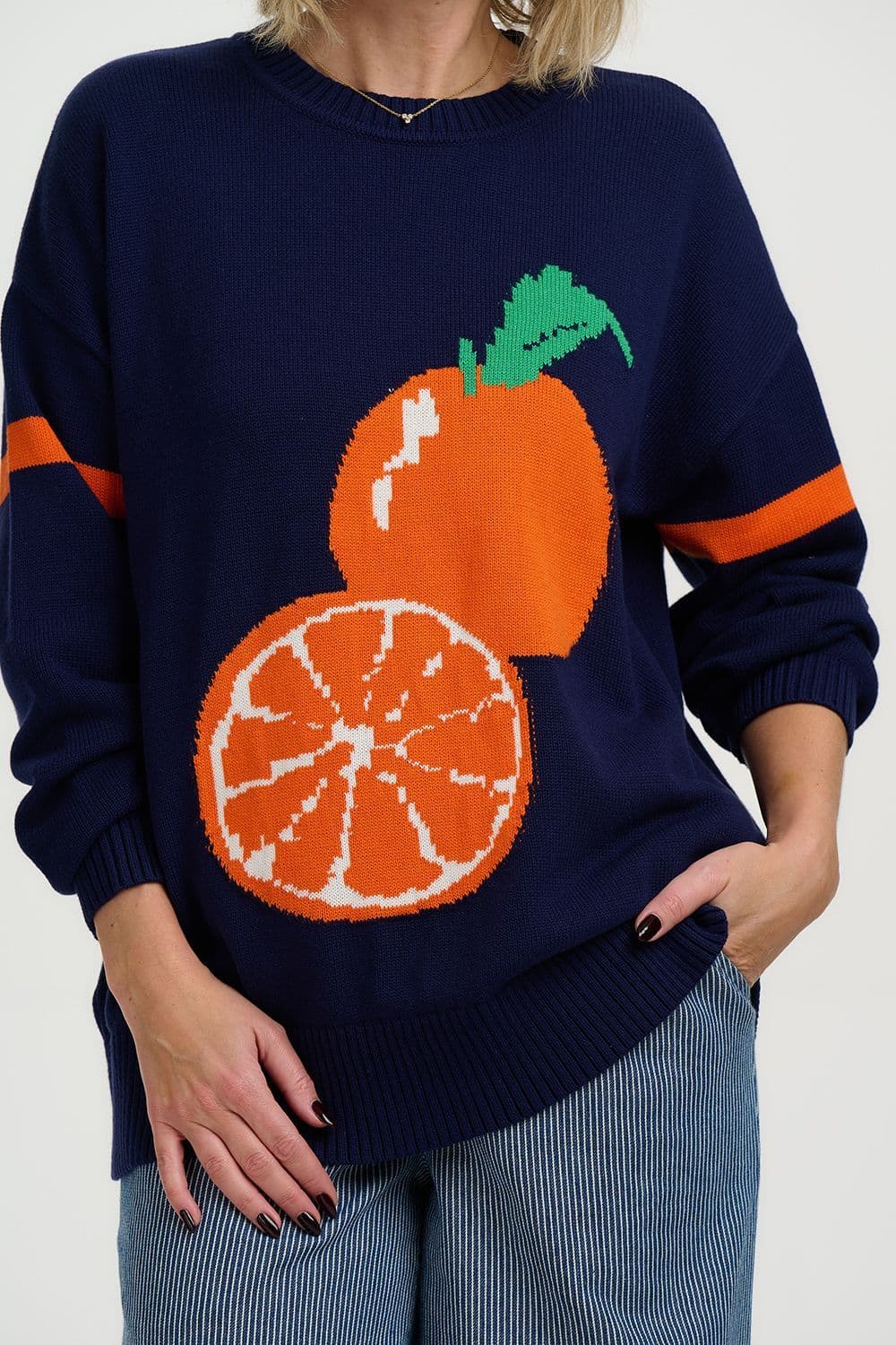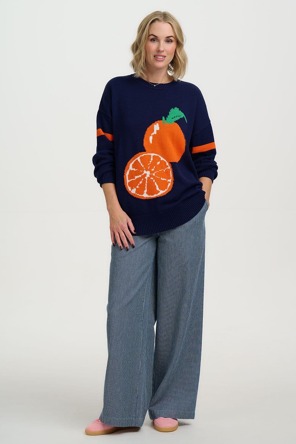 This delightful sweater from sugarhill has a vibrant design of oranges on a navy background. It is an ideal weight for a cooler Spring day.