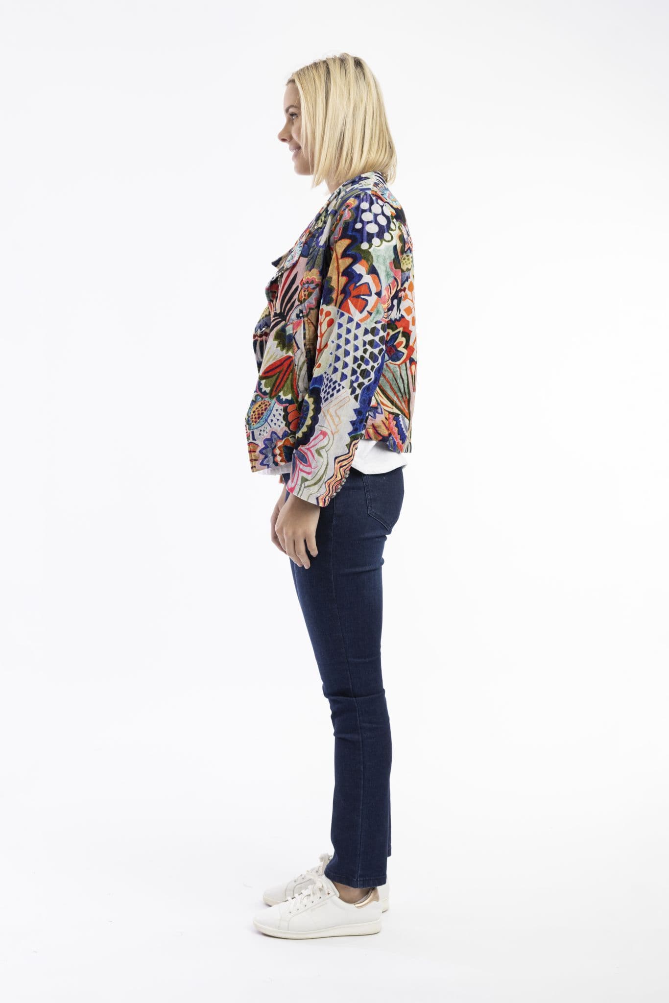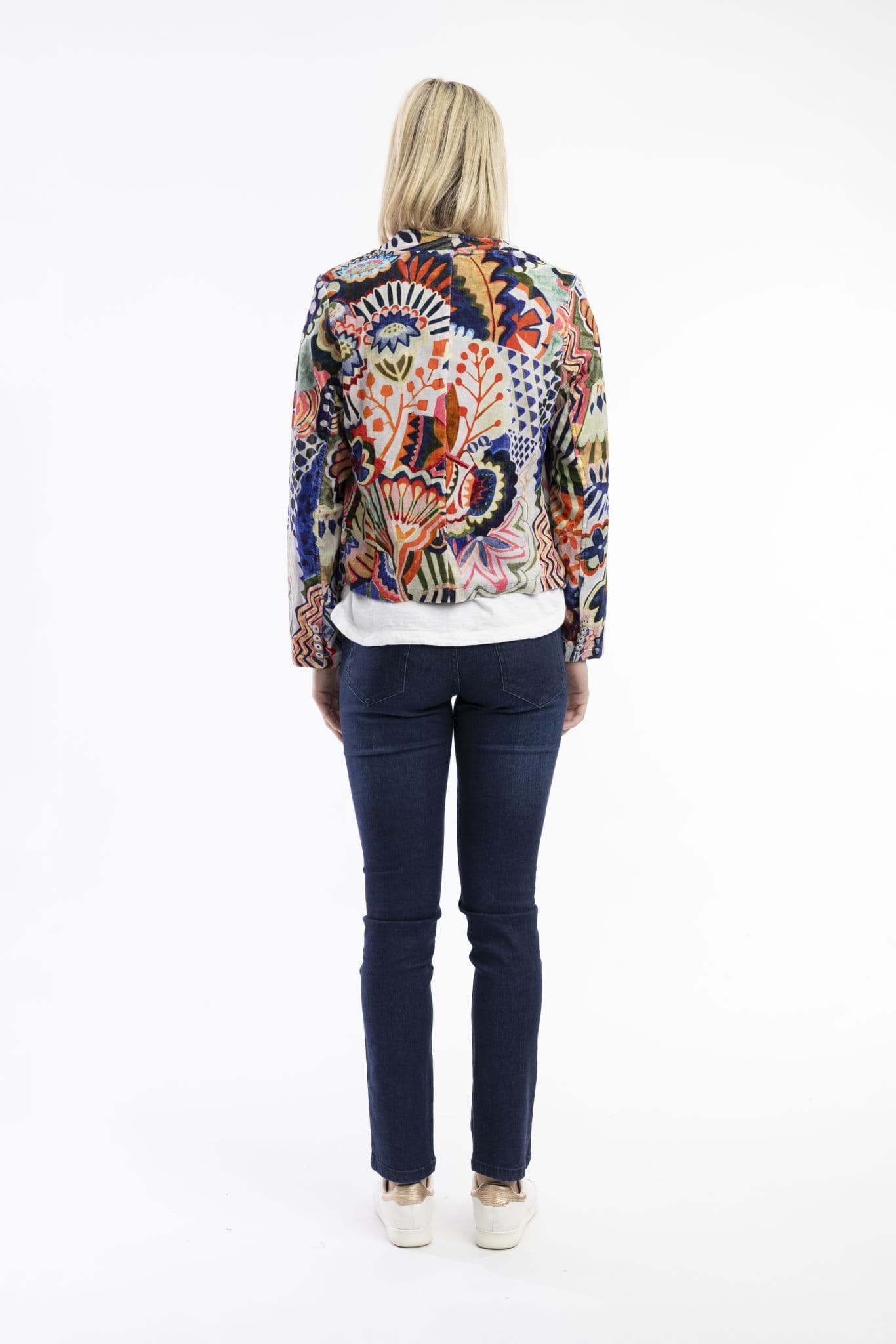 We all love this short jacket from Orientique! It is an unusual style - very colourful and cut on the cross. We think it is best worn with either smart trousers or chinos. It is a jacket that makes a statement!