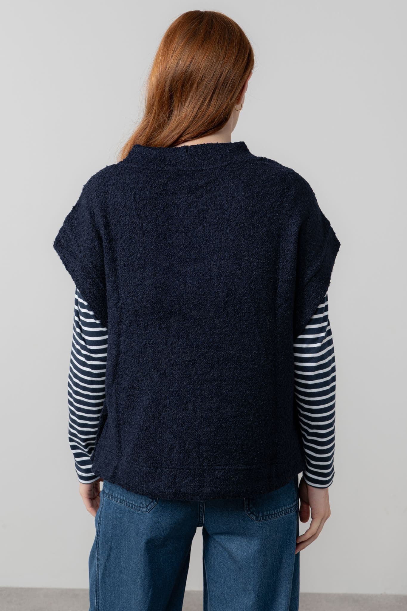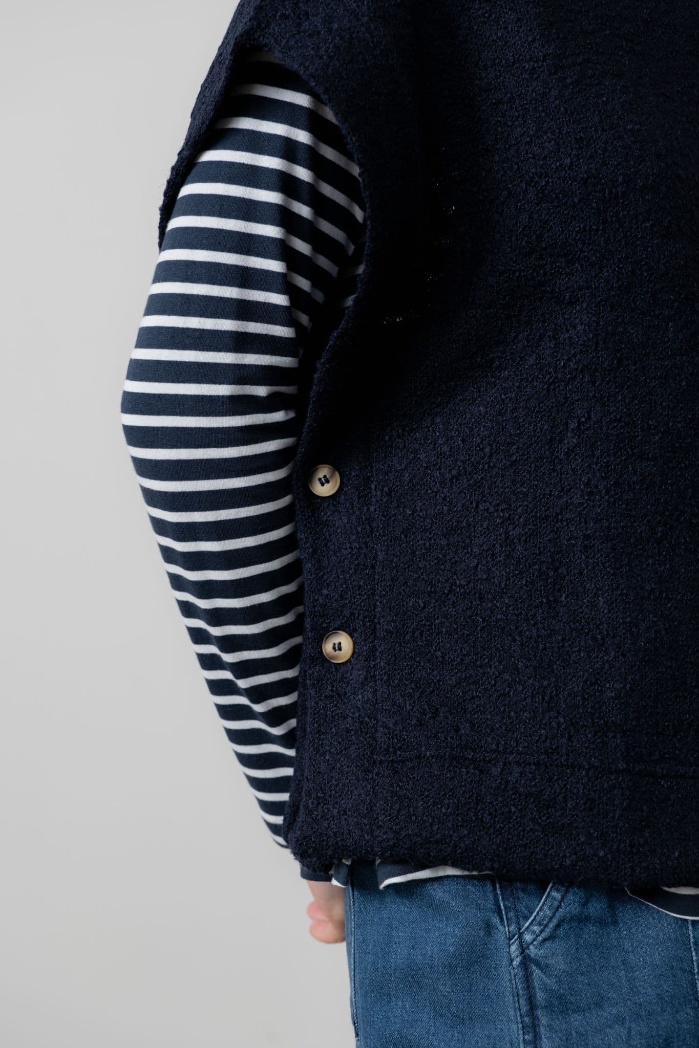 This cosy, sleeveless pullover from Lily & Me is a great layering piece for chilly days. It has a round neck with button sides.